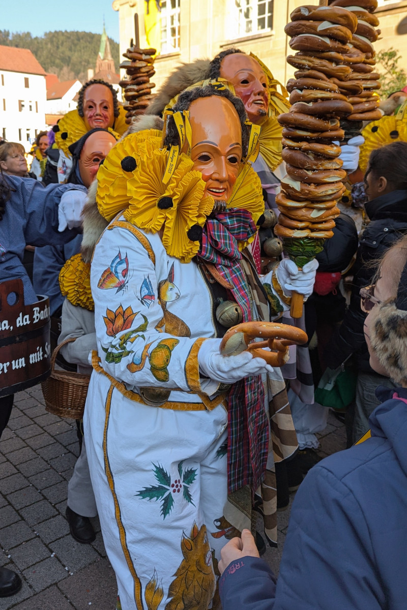 Encore un très beau carnaval historique et très original à env. 1h30 de Strasbourg. Et un cérémonial aussi drôle qu’étrange…Les costumes sont aggrémentés de grosses clochettes et les fous avancent dans un joyeux tintamarre. Mais le clou du spectacle, c’est la bénédiction du Bretzel ou Brezelsegen. Après le traditionnel défilé du Hanselsprung qui se tient le dimanche, les fous se retranchent dans l’hôtel de ville. Ils en ressortent 20 minutes plus tard – toujours aussi frétillants – en brandissant des sortes de perches sur lesquelles sont empilés des bretzels. Plus de 15000 bretzels, produits pour l’occasion par les boulangers de la ville, sont distribués aux badauds jusqu’à 17h. Mais à une condition. Sautiller en poussant la chansonnette. Un petit droit d’entrée de 2,50€ vous sera demandé. Le Carnaval de Schramberg est célèbre pour son second temps fort, la Da-Bach-Na-Fahrt qui a lieu le lundi. Les carnavaliers font du rafting sur la Bach (le ruisseau) à bord d’embarcations complètement folles.
