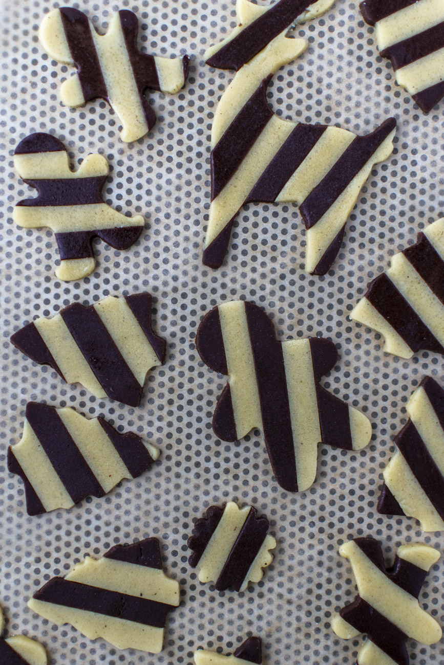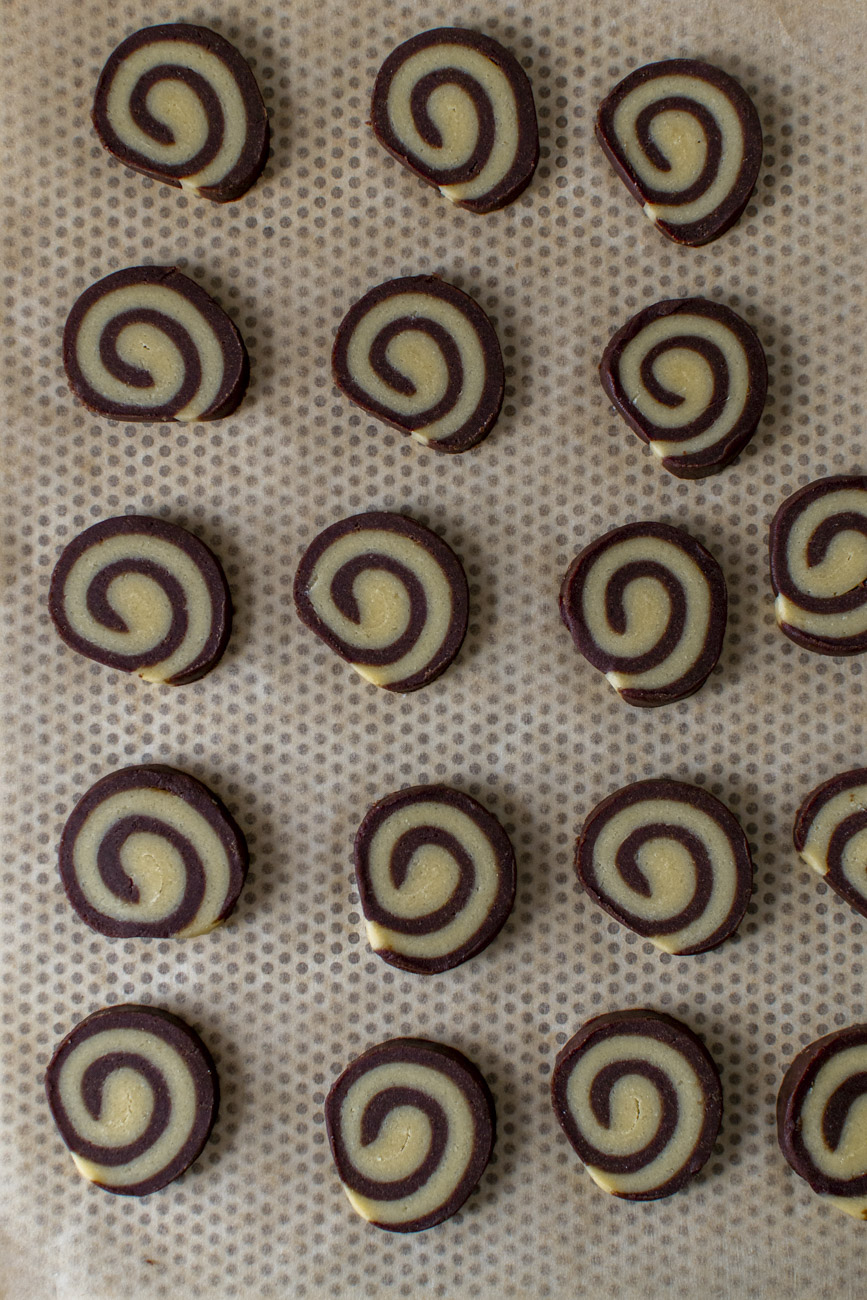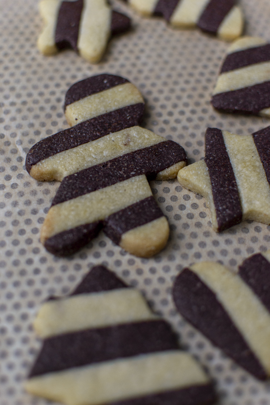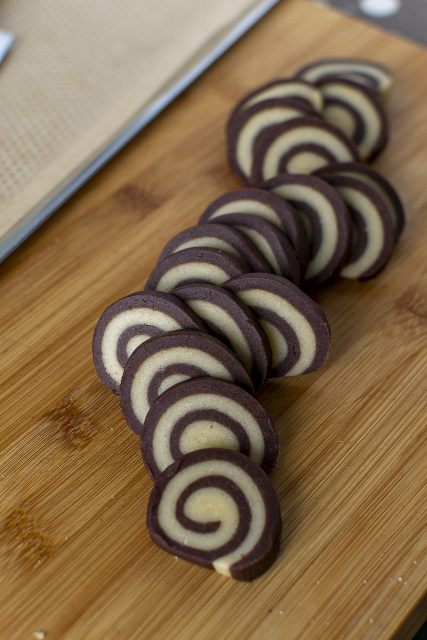 Pour les sablés spirales, pas de grosses difficultés, on superpose, on roule en escargot et le tour est joué (on essaie quand même de faire un truc propre et d’avoir des épaisseurs homogènes). Pour les rayures, c’est un peu plus long mais moins fastidieux que les damiers. Et c’est finalement cette dernière version, plus graphique et originale, que je préfère.