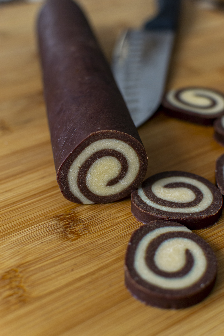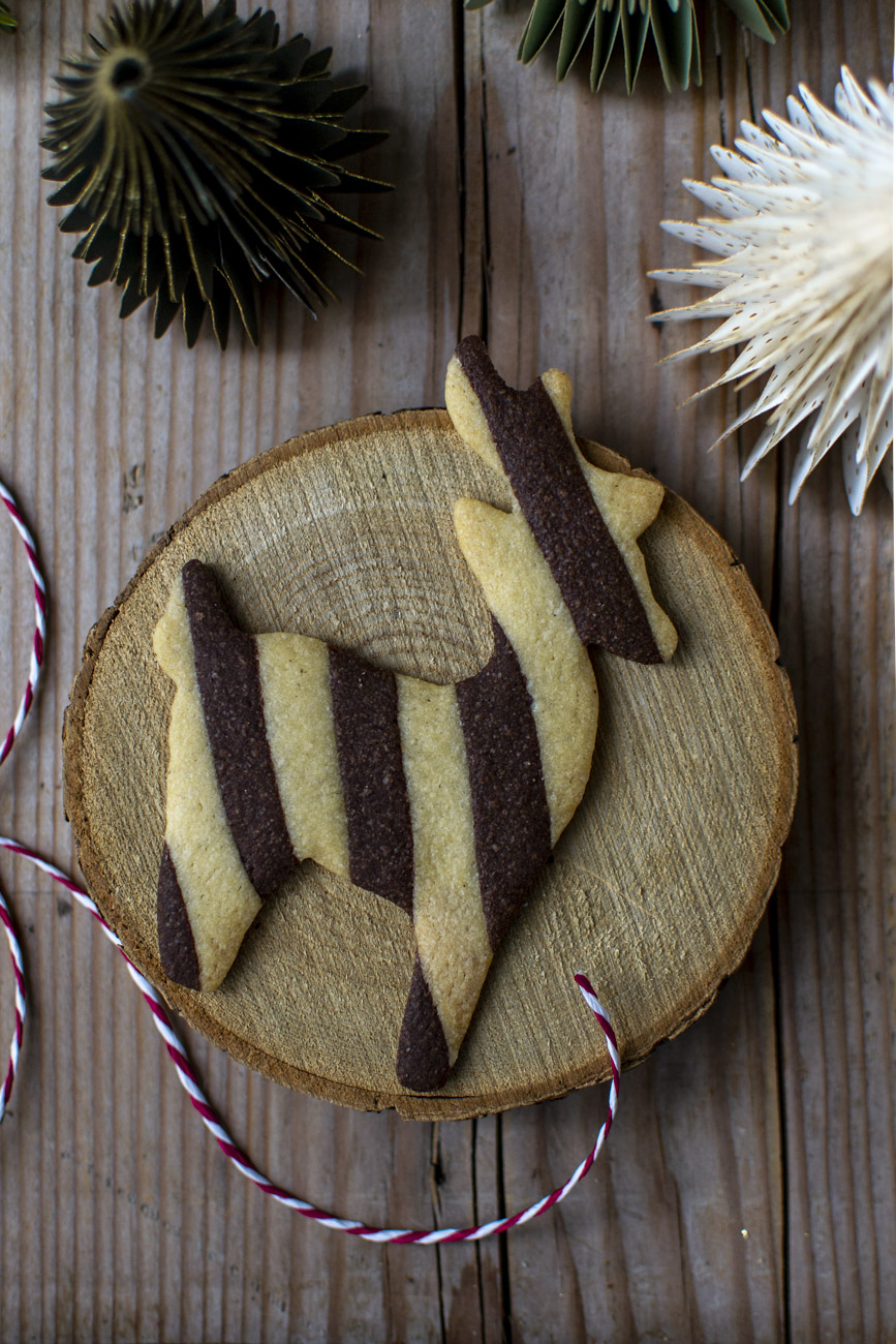 Les sablés bicolores (et bi-goût !) sont toujours du plus bel effet dans la boite a bredele…Mais qu’on se le dise, les sablés damiers – ces bredele qui ressemblent à de petits échiquiers – ne sont pas les plus rapides à réaliser. Enfin surtout quand on est du genre tatillon. Multipliez les couches, prenez votre mal en patience (et un Doliprane). Pas question de bâcler le travail, on aime la précision et la régularité par ici (ndlr : pour les psychorigides du bredele, se munir de baguettes de pâtisserie pour avoir des épaisseurs impec’). Sur l’échelle de la difficulté, de plus simple au plus complexe : spirales, rayures et damiers.